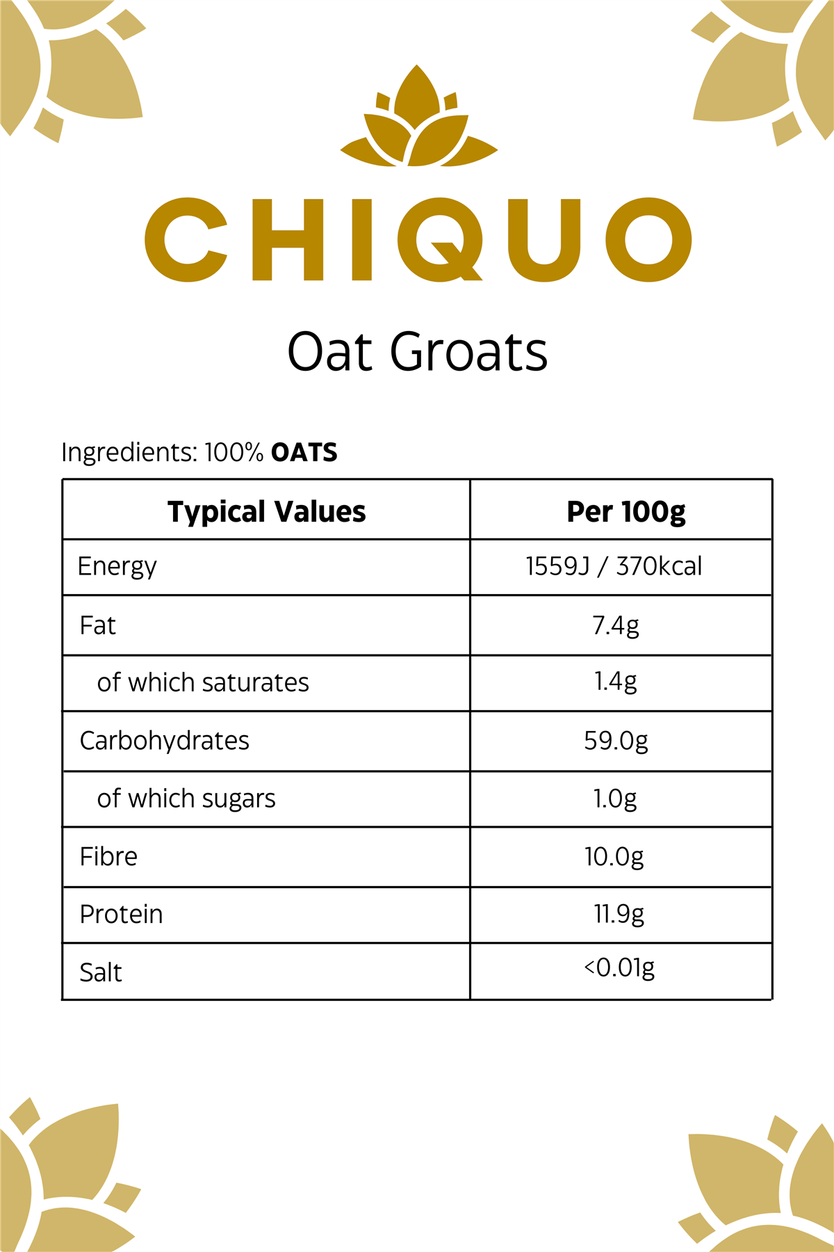 Chiquo Oat Groats can be used in a variety of ways — cook them slowly for a traditional bowl of porridge, soak them overnight, or grind them using a home mill or food processor to create oat flour for baking. They can also serve as a base grain for savoury dishes, grain bowls, or pilaf-style recipes.