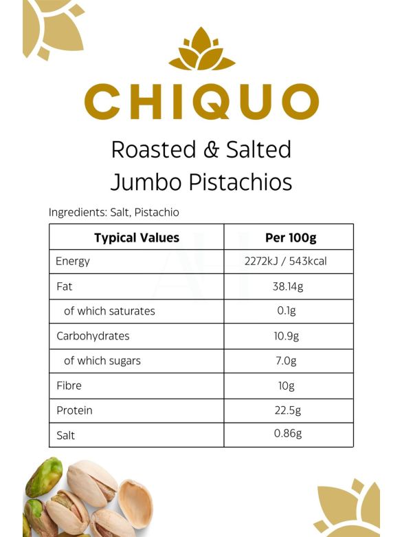 Experience the bold flavour and satisfying crunch of Chiquo Roasted & Salted Jumbo Pistachios – a premium, healthy snack designed for every lifestyle. These jumbo pistachios are roasted to perfection and lightly salted, making them the ultimate guilt-free indulgence for snacking anytime, anywhere.