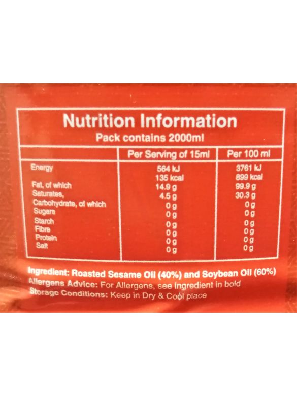 Ingredients: Roasted Sesame Oil (40%), Soybean Oil (60%).