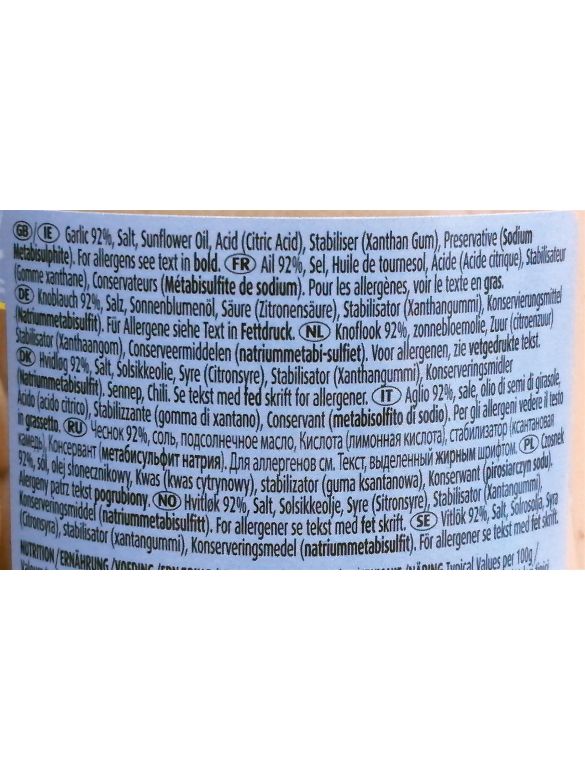 Ingredients: Garlic 90%, Water, Salt, Citric Acid (330), Potassium Sorbate (202), Sodium Benzoate (E211), Xanthum Gum (415), Sodium Meta Bi Sulphite (E223), Ascorbic Acid