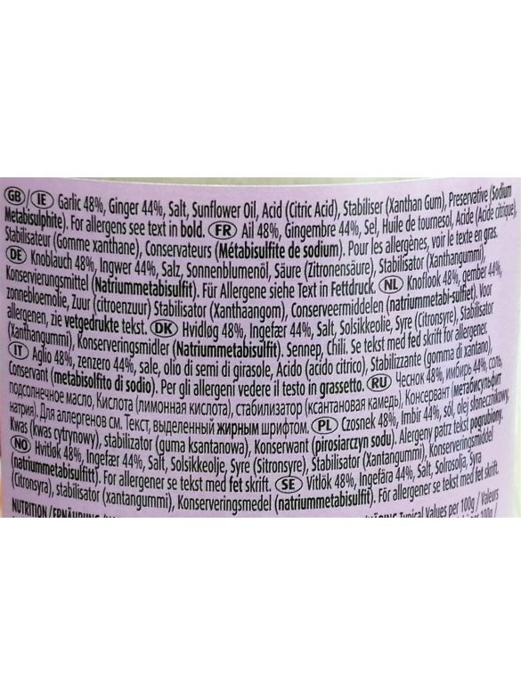 Ingredients: Garlic, Ginger, Salt, Citric Acid, Potassium Sorbate, Sodium Benzoate, Xanthan Gum, Sodium Meta Bi Sulphite, Ascorbic Acid.